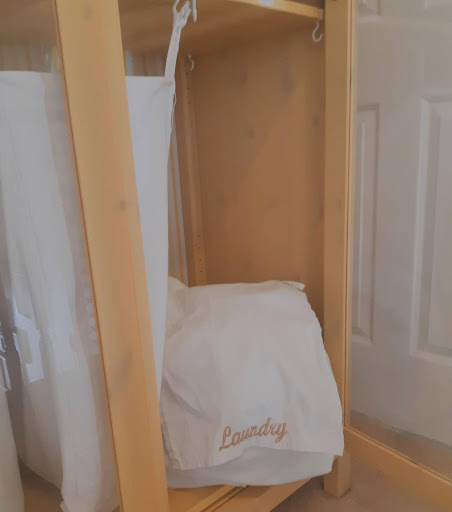 Cotton laundry bags work well because they’re breathable, easy to remove on wash day, and can be laundered easily. Choose ones with loops or handles that can hang easily from the hooks.