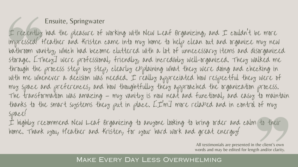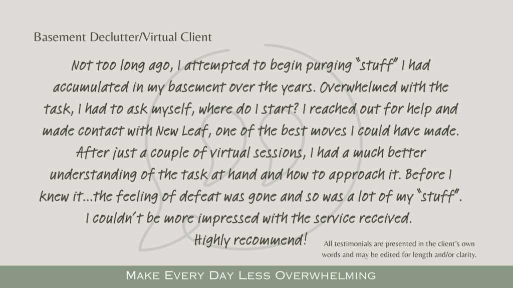 By taking that first step and getting organized, you’ve made an investment in yourself to create meaningful change in your space and your life. Now, in partnership with Dare to Declare™, you can continue to build the habits, systems, and self-understanding that help that clarity last. Maintain momentum and move forward with intention. Exclusively for New Leaf Organizing Maintenance clients.