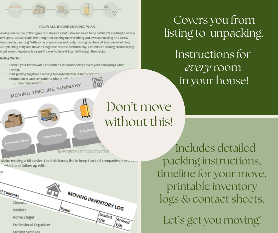 Moving can be one of life’s greatest stressors, but it doesn’t need to be. While it’s exciting to have a new space, a clean slate, the thought of packing up everything you own and hauling it to a new place can be daunting. Our Moving Package includes a timeline to guide you through when to start each phase of your move, what to pack, how to pack it, inventory log, important contacts, and tips for unpacking in your new space! Last-minute rushing around trying to get everything done is a sure-fire way to have things fall through the cracks – It’s your move. Let’s do it right!